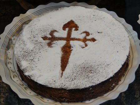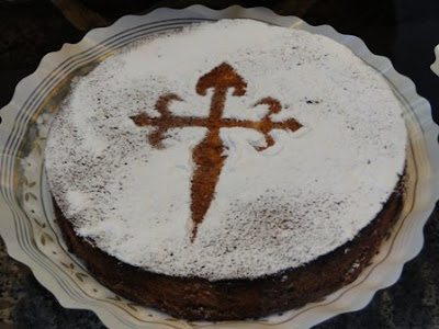 Torta de Santiago com a típica representação da Cruz de Santiago, é uma sobremesa tradicional da Galicia, na Espanha, podendo ser encontrada um pouco por toda a Espanha.